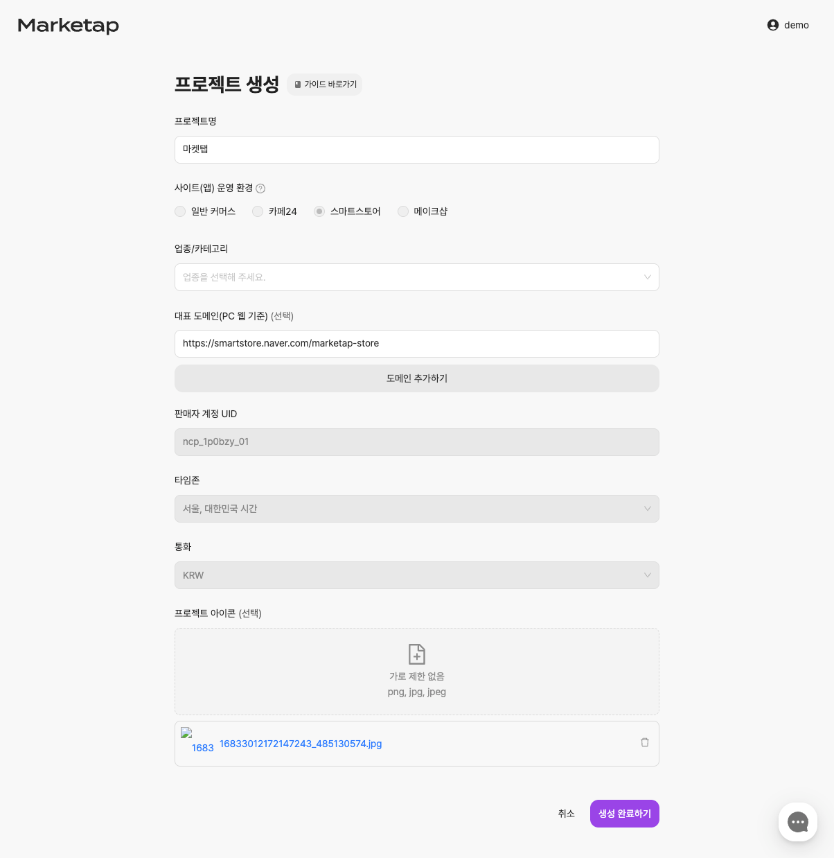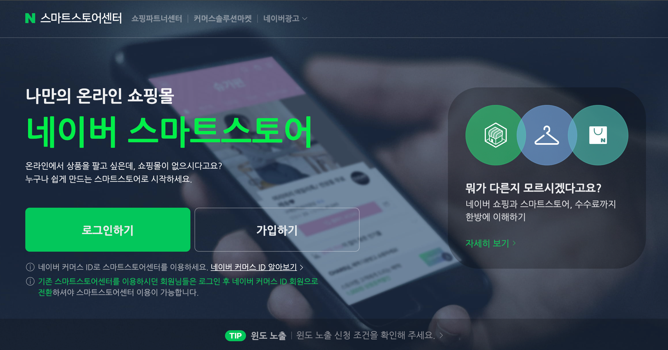 ① 프로젝트 생성하기 버튼을 클릭한 후, 운영 환경에서 "스마트스토어"를 선택합니다.