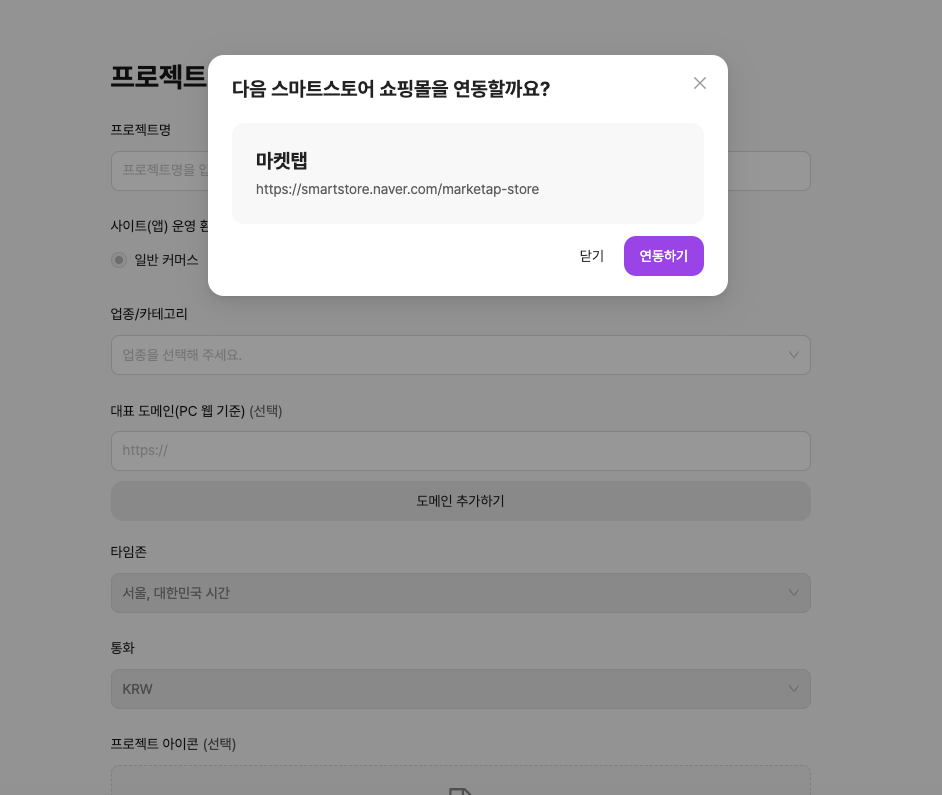 ③ 이어지는 생성 화면에서 연동하기를 선택해 진행합니다. 추가 정보를 입력한 이후 프로젝트를 생성할 수 있습니다.