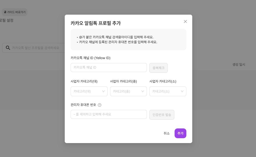 카카오 발신 프로필은 알림톡 메시지를 발송하기 위해 필요한 설정입니다.